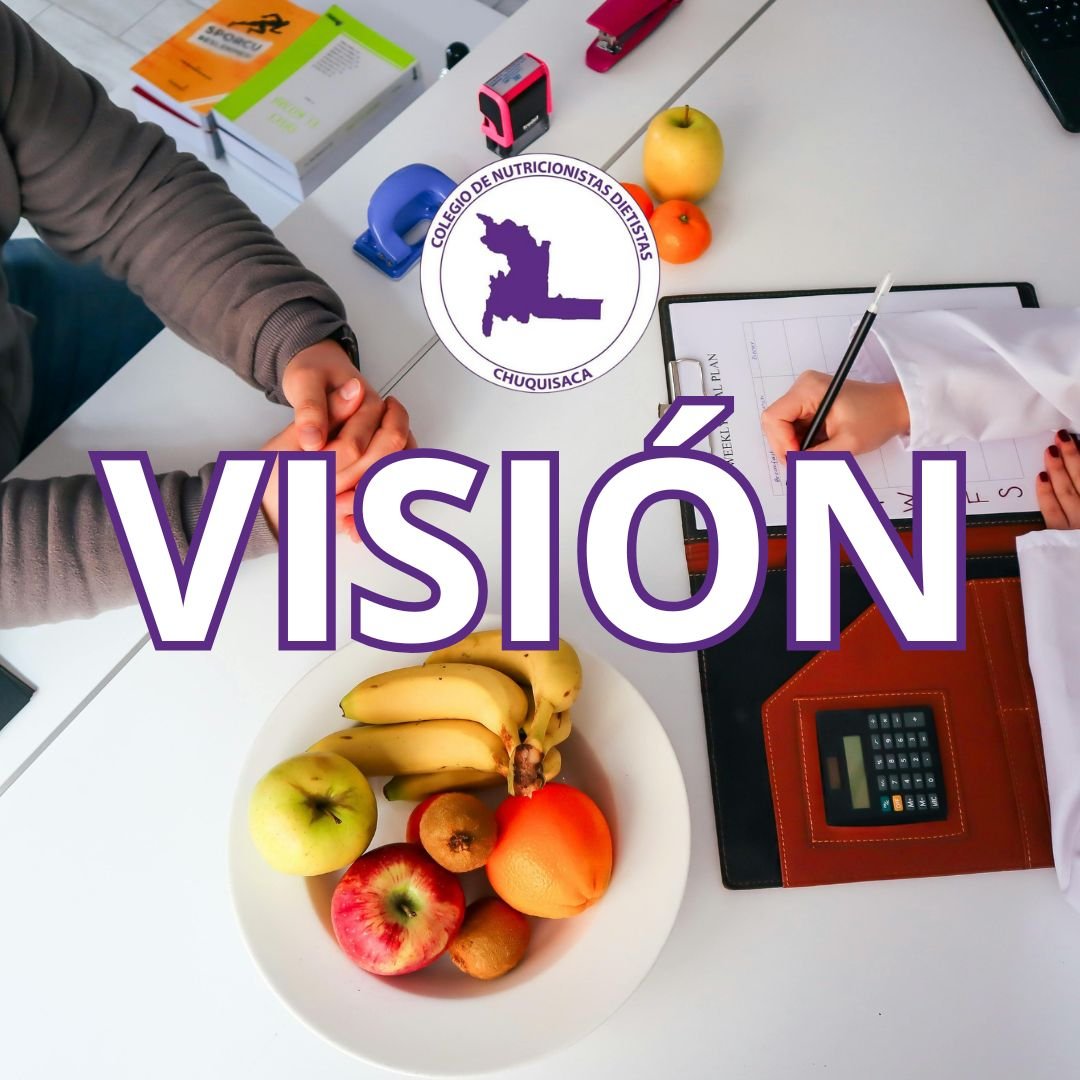 Ser una institución de referencia en Bolivia por su liderazgo en la defensa, promoción y desarrollo del ejercicio profesional del nutricionista, reconocida por su compromiso con la ciencia de la nutrición, la ética profesional y su impacto positivo en la salud de la población.